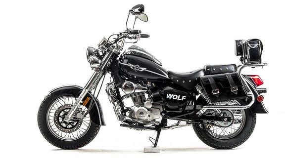Дорожный мотоцикл MOTOLAND WOLF 250 - стильный и лаконичный дизайн способен порадовать глаз любого мужчины. Мощный движок и крутейшие технические характеристики - вот, что отличает его от собратьев. Этот байк просто создан для езды по городским джунглям!Чоппер WOLF 250 сразу привлекает внимание своим внешним видом. Выполнен в винтажно-классическом стиле с удлинённой рамой и передней вилкой, обилием хромированных элементов. Солидный, матово-чёрного цвета — этот чоппер выглядит значительно лучше своей ценовой категории.Мото чоппер весит 130 кг. Колёса спицованные, диаметр колёс — 16 дюймов (400 мм). Передний тормоз гидравлический дисковый с однопоршневым суппортом, прочно закреплён на 6 болтов. Тормозной шланг защищён специальным изолятором. Задний тормоз барабанный, легко регулируется даже в полевых условиях.Рама классическая, закольцованного типа. Вилка телескопическая, удлинённой формы, дополнительно защищена специальными металлическими кожухами. Есть нижние и верхние массивные траверсы. Руль сечения 22 мм с высоким подъёмом удобен для мотоциклистов разного роста. Зеркала заднего вида большие, с хорошим обзором. На ручках расположены кнопки дальнего и ближнего света, сигнал аварийной остановки, кнопки включения и выключения двигателя, блинкер, поворотники, звуковой сигнал. Также на руль вынесен подсос, что удобно при холодном запуске. Переднее и заднее крыло сделаны из прочного жёсткого пластика и близко прилегают к колёсам, подчёркивая городское и шоссейное назначение чоппера. На заднем крыле установлен стоп-сигнал и крепление для номера.Удлинённый руль и форма сиденья делают посадку максимально комфортной и позволяют держать спину прямо, снимая часть нагрузки с поясницы. Большое сиденье удобно для длительных поездок. Сиденье для пассажира оснащено специальной мягкой спинкой.Чоппер просто утопает в свете. На мотоцикл установлена большая фара ближнего и дальнего света, большие поворотники, светоотражатели. Такой чоппер невозможно не заметить даже в темноте или при плохой видимости.Купить мотоцикл чоппер стоит и за технические характеристики. Мото чоппер оснащён 4-тактным 1-цилиндровым двигателем с воздушным и маслорадиаторным охлаждением. Мотор мощностью 18 л. с. и объёмом 250 кубов разгоняет чоппер до 110 км/ч. Карбюратор с ускорительным насосом даёт хороший отклик на резкий старт и позволяет быстро набрать скорость. Расход топлива небольшой — 4 литра на 100 км. Трансмиссия механическая, включает 5 скоростей. Подножки удобные, дают возможность легко переключать передачи. Мотоцепь 420 защищена специальным кожухом. На чоппер установлены 2 выхлопные трубы.На панели приборов есть спидометр, индикаторы поворотников, индикатор нейтральной передачи, дальний свет. Здесь Вы можете получить всю информацию о состоянии мотоцикла: километраж, пробег, скорость, обороты двигателя.