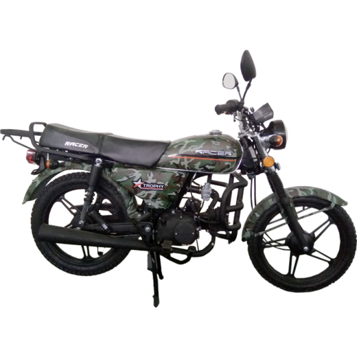 Racer RC110N-K Trophy - недорогой малокубатурный мотоцикл, на котором приятно поездить на асфальте и ровным проселочным дорогам. Сердцем мотоцикла является одноцилиндровый четырехтактный двигатель объемом 107 см³ и мощностью 7,1 л/с. Трансмиссия: механическая (1-N-2-3-4). Надежные барабанные тормоза идеально подходят для мотоцикла такого класса. Цепной привод защищен специальным кожухом. Имеются стальные дуги безопасности. Колеса: легкосплавные алюминиевые, с покрышками 2,50-17 / 2,75-17. Расход топлива 2,2 л/на 100 км при объеме бака 6 л.