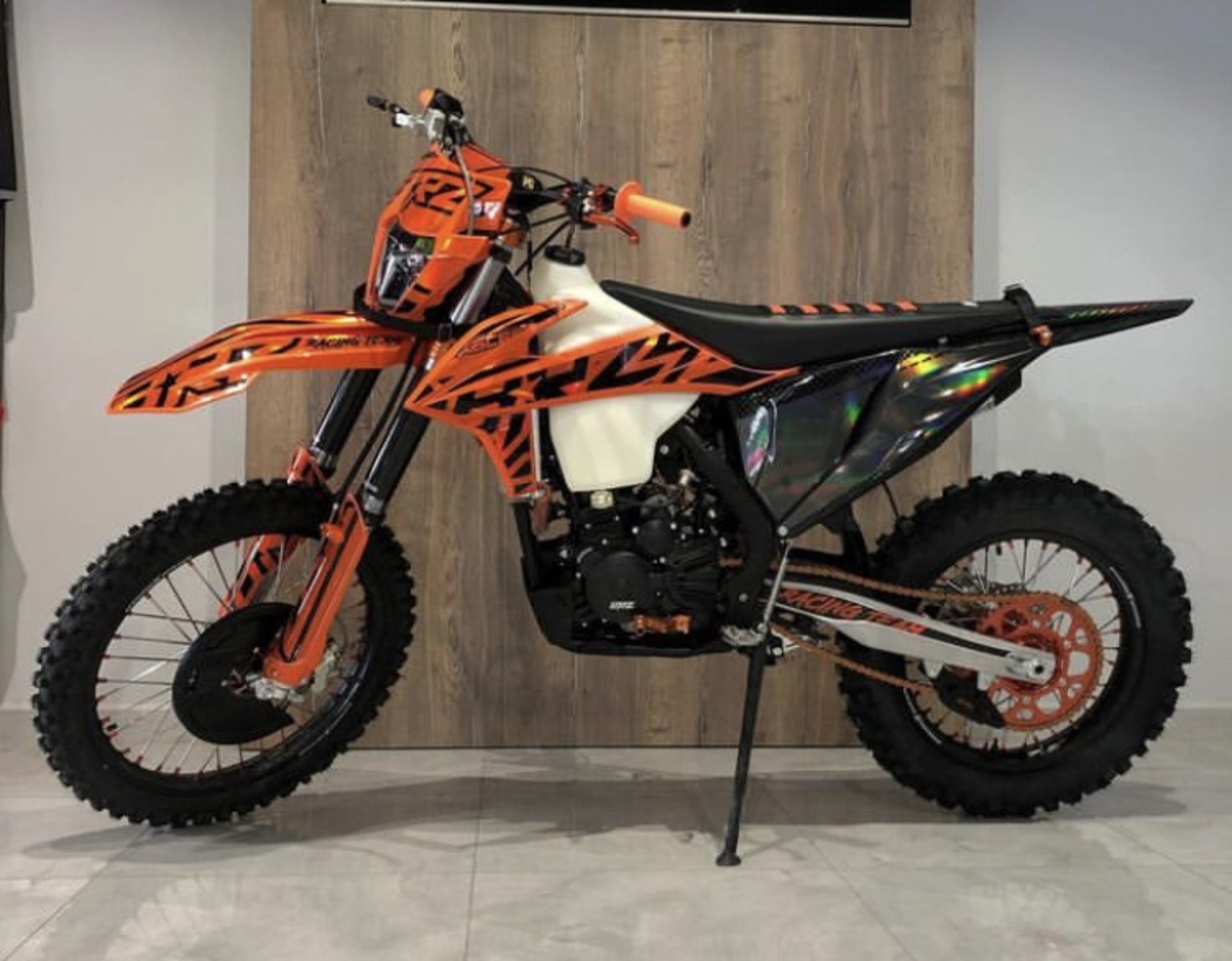 Комплектация Руль IGP twinwall 28мм алюминиевый, короткоходная ручка газа NIBBI, ручки IGP "неломайки", Алюминиевые фрезерованные траверсы CNC. Цепь 520. Алюминиевые подножки водителя и лапки КПП, Алюминиевая защита картера, защита тормозного диска, защита маятника, защита рук, боковая защита рамы, алюминиевая ведомая звезда CNC