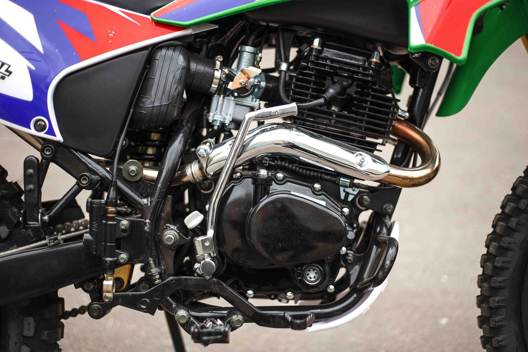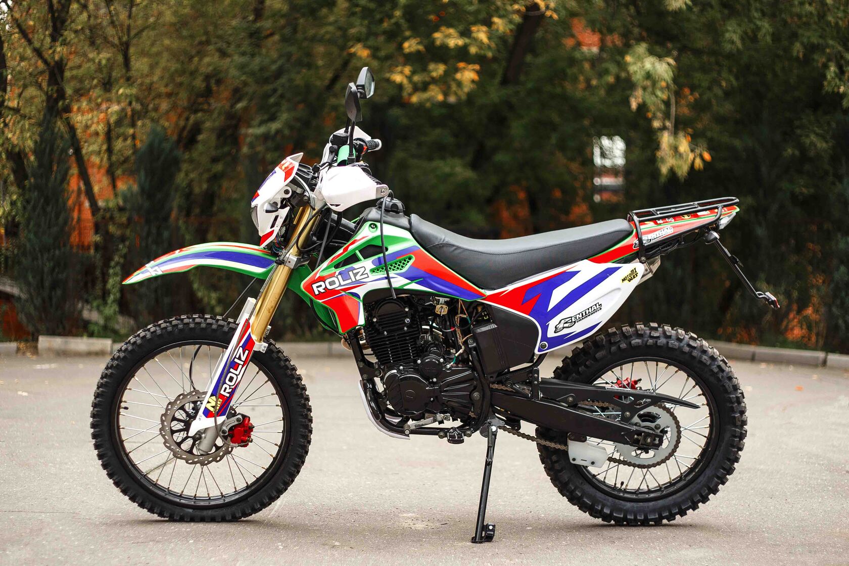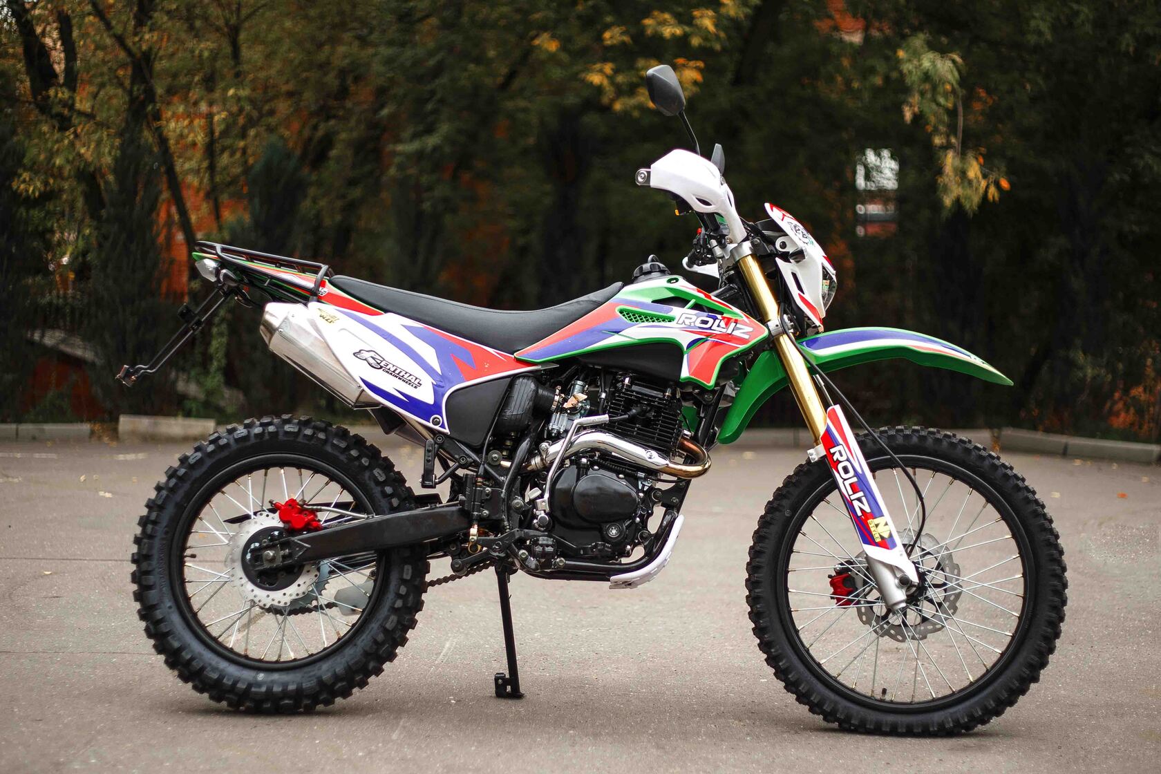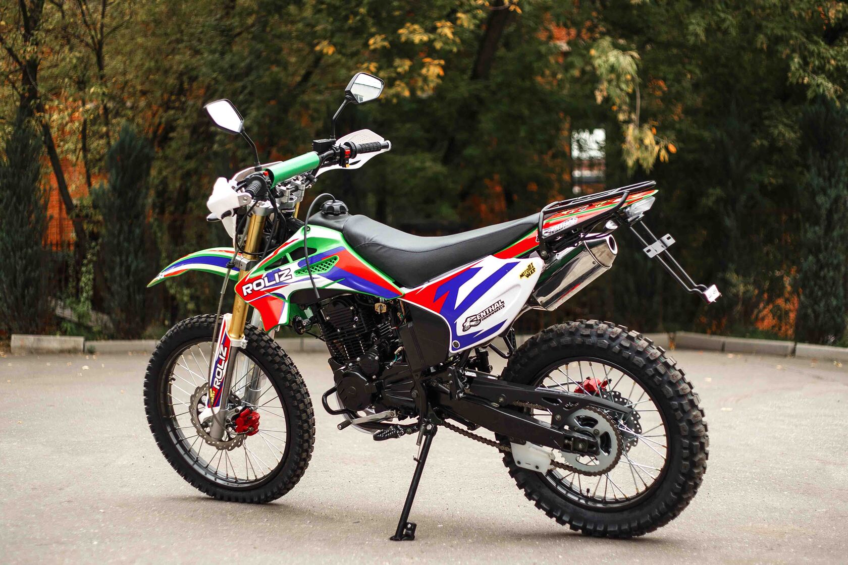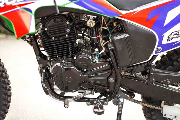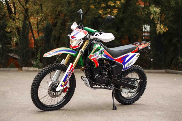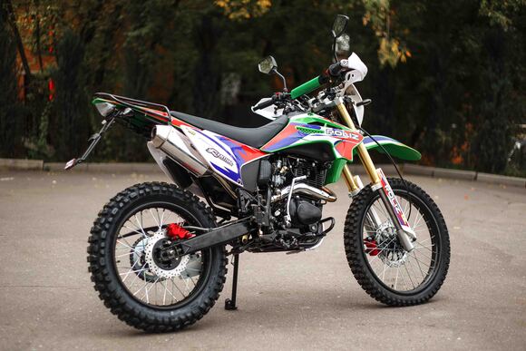 Эконика SPORT-003 – новый внедорожный мотоцикл. Его стоимость значительно ниже брендовых моделей со схожими характеристиками, но качество сборки в целом, как и отдельных деталей, отличное. В стальной раме с баком 6,5 литров установлен четырехтактный одноцилиндровый двигатель 172FMM с механической коробкой передач и воздушным охлаждением. Мотоциклы оснащаются карбюраторами PZ 30 . Для удобства запуска мотора предусмотрен электростартер.Мотоцикл оснащен фарой головного света, что является необходимым условием для езды в сумерках и темноте, и LED указатели поворота. Масса мотоцикла составляет порядка 140 кг. Габариты довольно большие – длина составляет 2240 мм., а высота по седлу – 930 мм., ширина руля- 855 мм. поэтому он отлично подойдет для тех, кто имеет рост от 175 см и выше.У нас Вы можете купить этот мотоцикл с бесплатной доставкой по РФ и гарантией до года. Также его можно приобрести в рассрочку или в кредит.