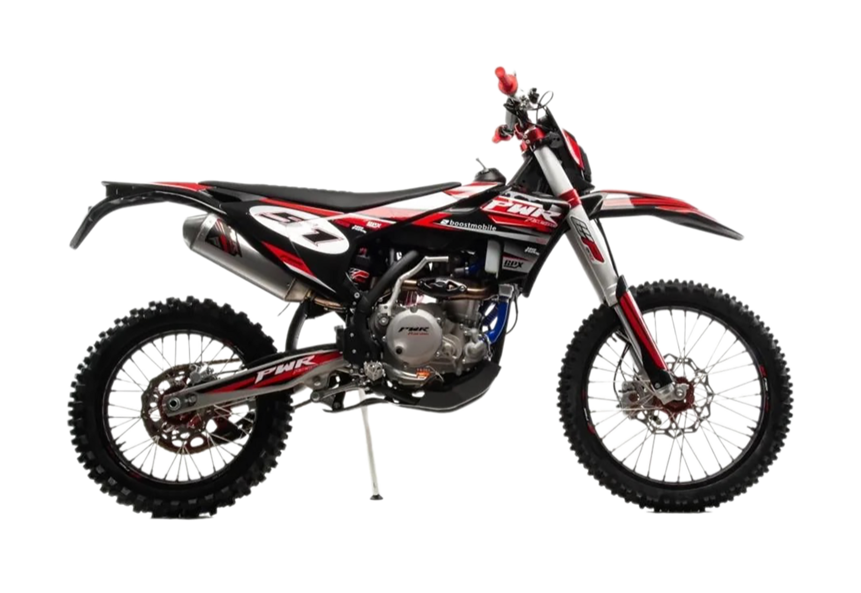 Топовый мотоцикл линейки PWR выглядит соответствующе — стильно и солидно. Без лишнего пафоса, но с уверенностью в собственном превосходстве над аналогами. Как и другие модели PWR, кроссовq 450 кубовый мотоцикл покрыт комбинированным пластиком, который не ломается при сгибании. Все стыки идеально подогнаны, наклейки ровные. Кроссовый мотоцикл доступен в синем цвете — внешний вид кросса подчёркивает несгибаемый характер и нацеленность на бескомпромиссную спортивную борьбу. Длина FS450 NC — 2160 мм, высота по седлу — 960 мм. Хорошее соотношение, которое подойдёт большинству пользователей среднего и большого роста.На кроссовый мотоцикл установлен руль переменного сечения (28 мм в месте крепления и 22 мм на концах под грипсами) с низким подъёмом и с подушкой IGP.