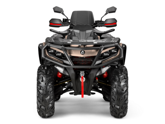 Комплектация Комбинация приборов: - Электронный ключ зажигания; - LCD приборная панель 6,86 дюйма с индикацией основных параметров: вкл/выкл полного привода, индикацией уровня топлива, сигналов поворота и аварийной остановки, подсветки, переключение режимов усилителя руля, информация о техническом обслуживании; - Лебедка с синтетическим тросом и тросоукладчиком, тяговое усилие 1500 кг.; - Ветрозащита рук на руле; - расширители колесных арок; - передний и задний бампер; - замок блокировки рулевого вала; - Электроусилитель руля; - cветодиодная оптика; - дополнительный свет; - фаркоп с электроподготовкой; - звуковой сигнал; - сигналы поворота; - зеркала заднего вида; - бардачок объемом 2 литра под сиденьем; - алюминиевые подножки водителя; - эргономичная задняя и передняя багажные площадки; - розетка 12 Вольт и USB.