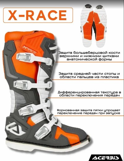 Легкие, защитные, анатомические ботинкиИзносостойкая кожаЗащита большеберцовой кости верхними и нижними щитками анатомической формыФормованная защита пятки упрощает переключение передач при запускеЗащита средней части стопы и области пальцев из пластика с ребрами жесткости для лучшего поглощения ударовДифференцированная текстура в области переключения передач для максимального контроля при переключении передач4 пряжками с большими алюминиевыми рычагамиМягкие и обволакивающие гетры из микрофибрыЗастежка-липучка, обеспечивает идеальную посадку гетры к ногеПротивоударная подошва Acerbis, устойчивая к маслам, бензину и износуАнтибактериальная амортизирующая стелькаПодкладка изготовлена из 3D сетки для оптимального комфорта и поглощения потаУсиленный стальной носокСостав: рециклированная кожа 41%, замша 10%, ТПУ 34%, ткань 15%