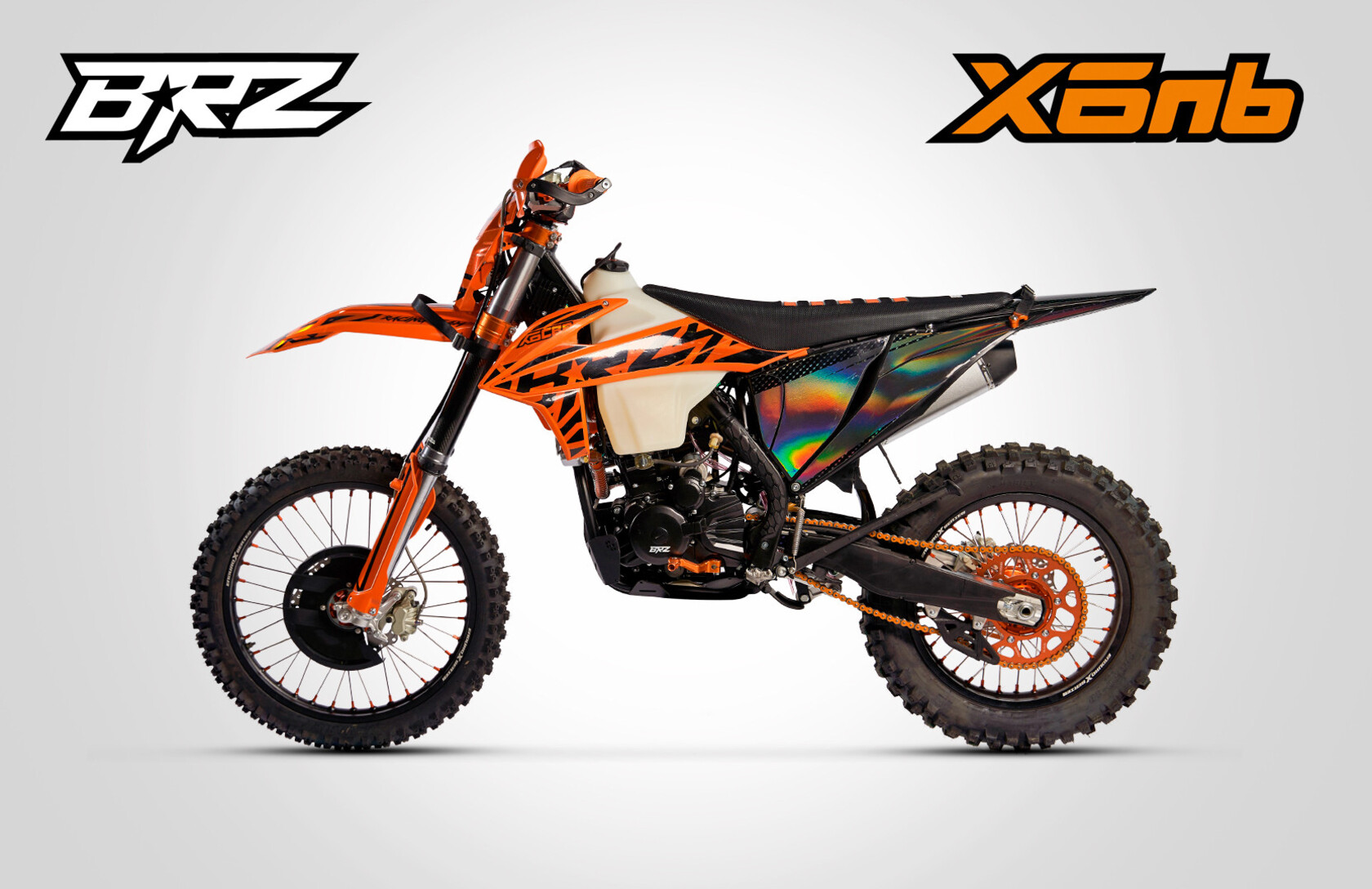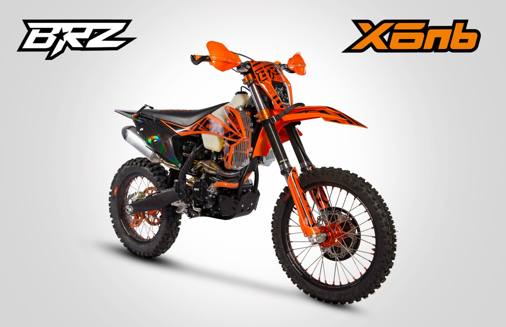 BRZ X6nb выполнен в дизайне KTM 2020-2022. Особую индивидуальность подчеркивает применение разного цвета пластика на передней и задней части мотоцикла. Задняя часть у всех моделей черного цвета. Передняя же часть выполнена в собственной цветовой схеме. Также получила новый дизайн фара головного света. Она стала пятидиодная с нижней «ресничкой». Особое внимание уделено наклейкам. В дизайне графики использованы новые технологии, которые позволили сделать отдельные элементы с зеркальным эффектом. Цвета всех элементов подобраны таким образом, чтоб мотоцикл был внешне максимально гармоничным и законченным.Особое внимание уделено сборке мотоциклов. Во всех мотоциклах BRZ с завода залито масло Motul 7100 10w40. Применяются влагозащищенные разъемы проводки. Все подшипники обработаны специальной консистентной смазкой. Вам больше не нужно тратить дополнительные деньги и время на подготовку мотоцикла к эксплуатации.