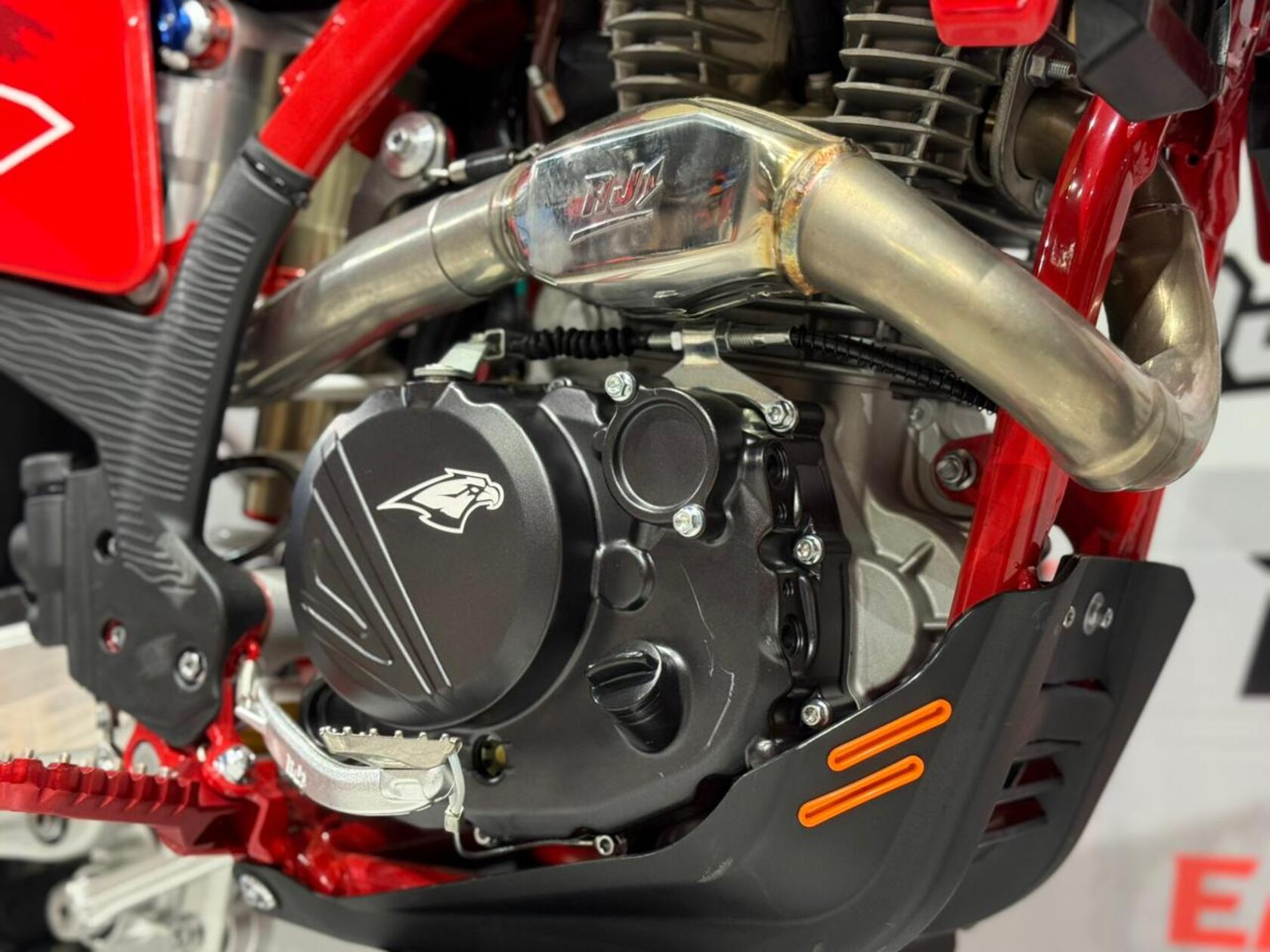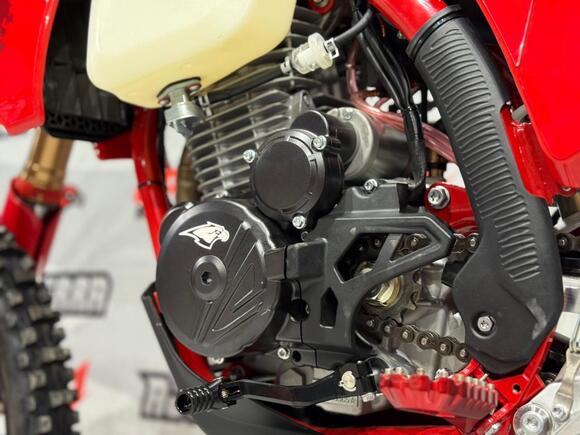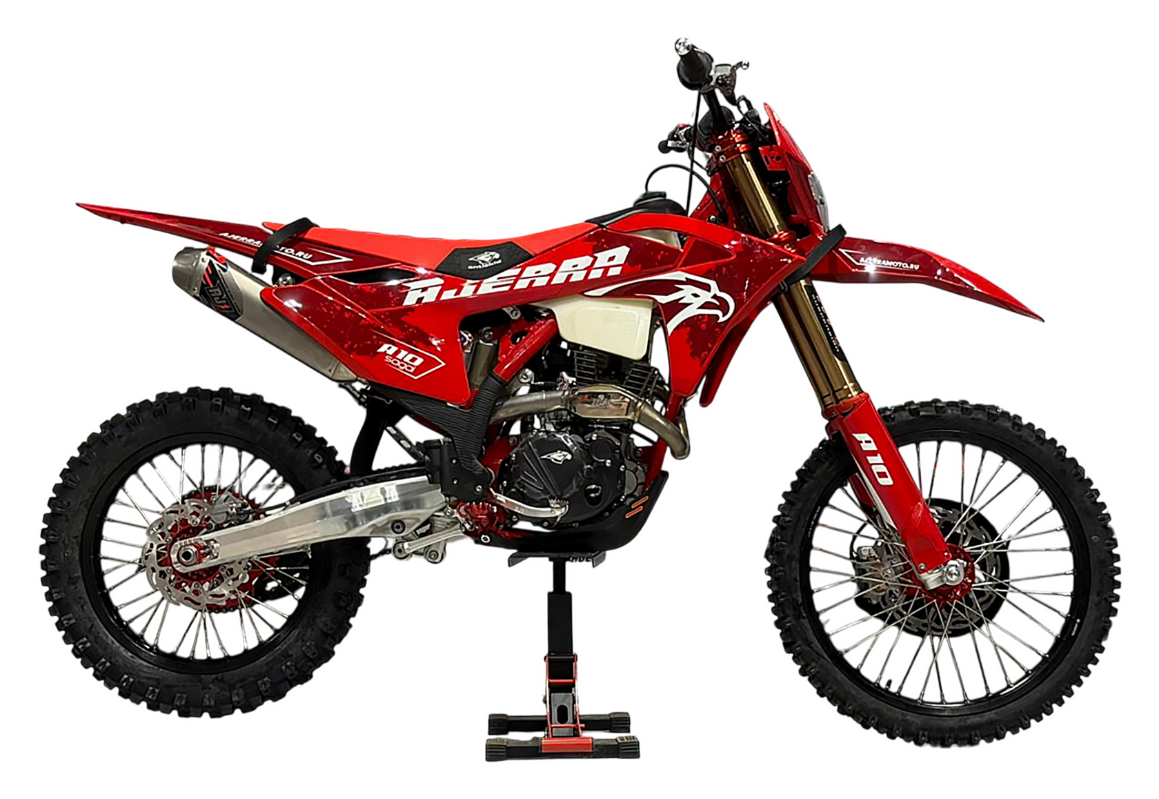Мотоцикл AJERRA SAGAI A10 YB300H — это современный эндуро-байк, сочетающий в себе надёжность, мощь и управляемость, созданный специально для тех, кто ценит уверенность на трассе и бездорожье. Построенный на прочной раме AJ1 К10 — копии легендарного KTM 2024 года, он демонстрирует высочайший уровень прочности и устойчивости при активных нагрузках. В сердце мотоцикла установлен проверенный временем двигатель Loncin YB300H 176 FMN с воздушным охлаждением. Мотор отличается стабильной тягой, простотой обслуживания и долговечностью, что делает его идеальным выбором как для тренировок, так и для любителей активных покатушек по пересечённой местности. В паре с надёжным карбюратором Nibbi Racing PWK 34 Black он обеспечивает точную подачу топлива и отзывчивость на газ. Подвеска здесь не уступает по качеству — передняя вилка HTW SCC 930 мм с одним картриджем и задний амортизатор HTW 2450 с прогрессией эффективно отрабатывают кочки и препятствия, обеспечивая максимальный комфорт и контроль в движении. Фрезерованные траверсы AJ1 2024 и алюминиевый маятник добавляют лёгкости и прочности конструкции, а система тормозов AJ1 с дисками на обеих осях гарантирует стабильное торможение даже в экстремальных условиях. Детали выполнены с вниманием к каждой мелочи: усиленный руль AL7075, алюминиевые подножки AJ1 2024 (копия S3), надёжная цепь KMC 520 Pro, эргономичные грипсы Lock ON и ручка газа Nibbi. Светодиодная оптика 2 EYE LED Generation 4 (50W) обеспечивает отличную видимость даже ночью. Алюминиевые обода UNISON 7116 и фрезерованные ступицы придают мотоциклу дополнительную прочность, а внедорожные покрышки Cordinal 80/100-21 и 120/90-18 обеспечивают уверенное сцепление с любой поверхностью. Комфорт и надёжность дополнены практичными элементами: счётчик моточасов, защита мотора и рамы, стропы для фиксации, заглушки руля и сиденье AntiSkid. Вся электрика работает от аккумулятора Skyrich Li-Ion, что гарантирует стабильный запуск и работу систем. Высота по седлу — 940 мм, что делает мотоцикл удобным для райдеров среднего и высокого роста. AJERRA SAGAI A10 YB300H — это мощный и сбалансированный эндуро-мотоцикл для тех, кто ищет универсальность и готовность к любым условиям. Он подойдёт как для тренировок и участия в любительских соревнованиях, так и для активного отдыха..