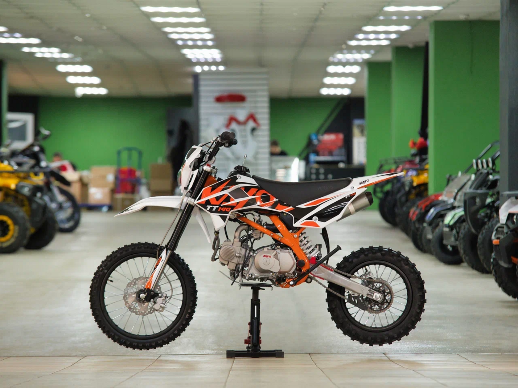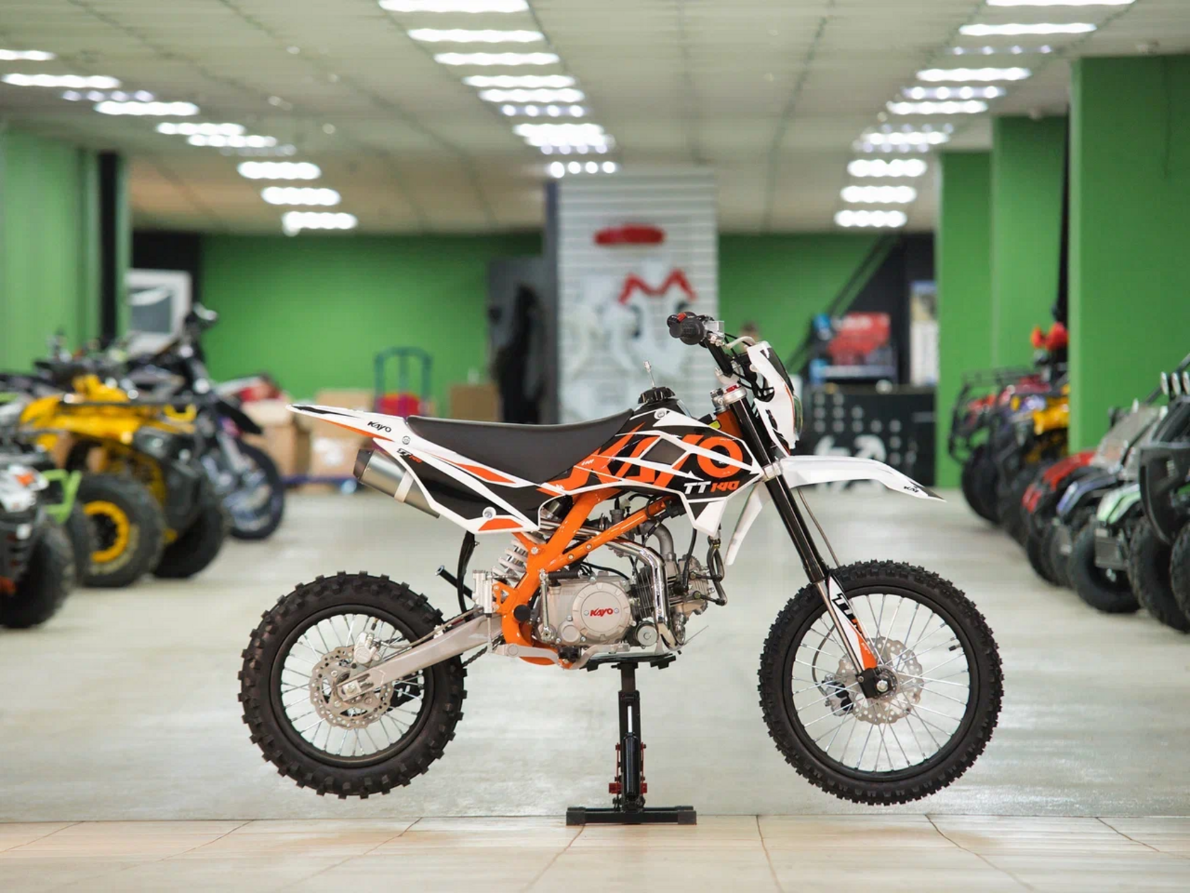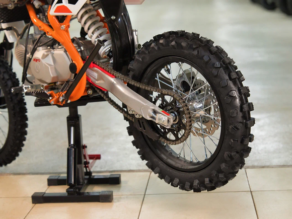 Питбайк KAYO Basic TT140EM KRZ – простой в обслуживании и выносливый байк для тренировок. Рекомендован подросткам, которые готовятся к соревнованиям, но подойдёт и для повседневных прокатов. Одноцилиндровый 4-тактный двигатель воздушно-масляного охлаждения YX1P56FMJ объёмом 140 см3, выдаёт 11 л.с. Карбюратор NIBBI PE19 обеспечивает бесперебойную работу техники в самых жёстких условиях эксплуатации, простоту и лёгкость в обслуживании, а также неприхотливость к качеству топлива. Питбайк имеет вместительный топливный бак на 5,5 л. Питбайк оснащён механической 4-ступенчатой коробкой передач с формулой “N-1-2-3-4”. Запуск двигателя осуществляется с помощью рычага кикстартера.Мотоцикл имеет вес всего 72 кг. Усиленная рама из хром-молибденового сплава и подвеска позволяют эффективно амортизировать удары при езде по неровностям и препятствиям на трассе. Передняя подвеска — телескопическая вилка перевёрнутого типа длиной 770 мм, задняя — моноамортизатор длиной 360 мм. Оба компонента подвески являются нерегулируемыми. Рама и пластик являются собственной разработкой производителя. Мотоцикл оснащён классическими стальными спицованными колёсами диаметром 17 дюймов спереди и 14 дюймов сзади. Эффективное и безопасное замедление с любых скоростей обеспечивают гидравлические дисковые тормоза. Высококачественная износостойкая резина с развитым протектором отлично держит дорогу на различных типах покрытия.Питбайк оснащён яркой светодиодной линзованной фарой, позволяющей кататься в тёмное время суток.Если вы ищете послушный, компактный, динамичный и красивый питбайк, считайте, что вы его нашли. Это один из лучших мотоциклов для обучения и первых шагов в эндуро и мотокроссе. Он отлично подойдёт как для гонок на трассе, так и для обычного катания по пересечённой местности.