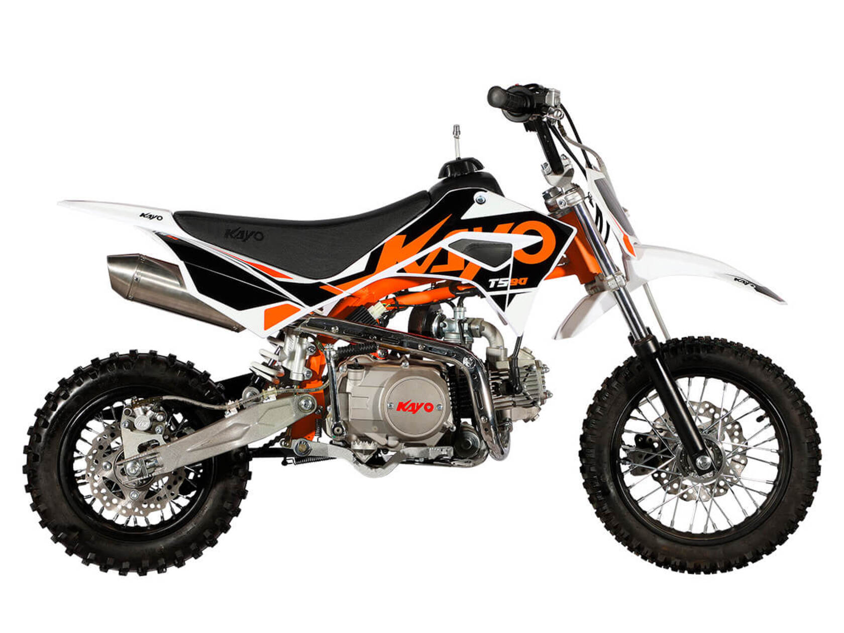 Питбайк KAYO Mini TS90 12/10 2022 года – идеальный снаряд для юных экстремалов, который можно использовать на лёгких кроссовых трассах и дорогах с различным покрытием. Удобный, простой и надёжный мотоцикл, который полностью оправдывает свою цену.Одноцилиндровый 4-тактный двигатель воздушного охлаждения ZONGSHEN YX147FMF объёмом 88 см3, выдаёт 5,5 л.с. Карбюратор JK PZ19 обеспечивает бесперебойную работу техники в самых жёстких условиях эксплуатации, простоту и лёгкость в обслуживании, а также неприхотливость к качеству топлива. Мотоцикл оснащён полуавтоматической 4-ступенчатой коробкой передач с формулой “N-1-2-3-4”. Запуск двигателя осуществляется с помощью кнопки на руле или рычага кикстартера.Мотоцикл имеет вес всего 60 кг. Усиленная рама из хром-молибденового сплава и подвеска позволяют эффективно амортизировать удары при езде по неровностям и препятствиям на трассе.Передняя подвеска – телескопическая вилка длиной 540 мм, задняя – моноамортизатор 270 мм. Рама и пластик являются собственной разработкой производителя. Мотоцикл оснащён классическими стальными спицованными колёсами диаметром 10 и 12 дюймов. Эффективное и безопасное замедление с любых скоростей обеспечивают гидравлические дисковые тормоза. Высококачественная износостойкая резина с развитым протектором отлично держит дорогу на различных типах покрытия.Если вы ищете послушный, компактный, динамичный и красивый питбайк для своего малыша, считайте, что вы его нашли.