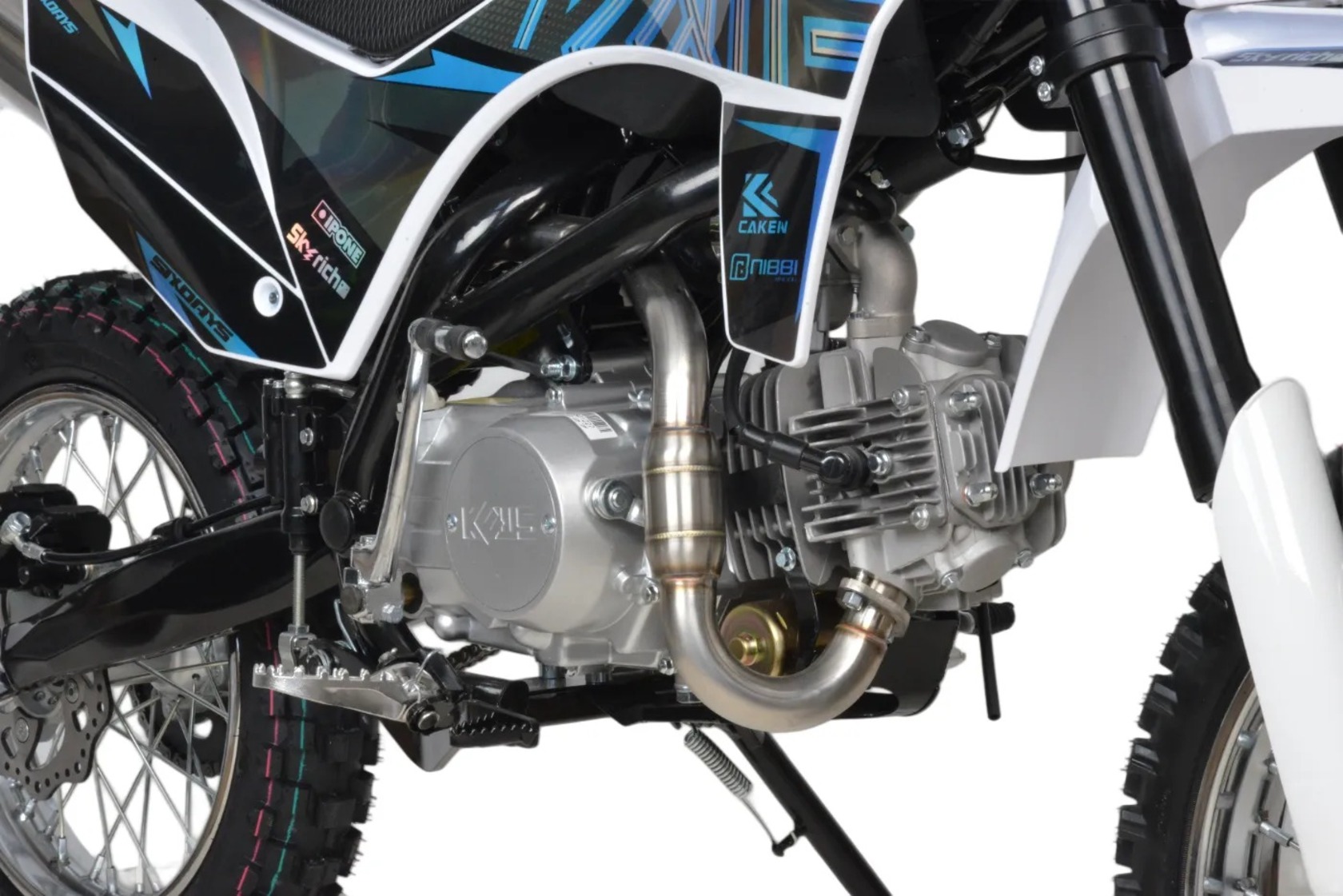 Питбайк KEWS K61 125 E 17/14 идеален для поездок по грунтовым дорогам и бездорожью. Хорошо чувствует себя на мягком и среднем грунте, разгоняется до 90 км/ч.Питбайк прост в управлении и не требует специального ухода, подойдёт как новичкам, так и любителям мотокросса.Конструкция подчёркивает неуступчивый спортивный характер, который не остановится ни перед одним препятствием.Передняя подвеска — телескопическая вилка, которая отлично подходит для преодоления ям, и других неровностей плохих дорог или их отсутствия. Задняя подвеска маятниковая с моноамортизатором.Питбайк оснащён карбюратором NIBBI PE19 и одноцилиндровым четырёхтактным двигателем 154 FMI с воздушным охлаждением, мощностью 11 л. с. и объемом 125 см³. Коробка передач механическая, четырёхступенчатая.Тормоза дисковые, передний тормозной суппорт двухпоршневой, задний — однопоршневой.Питбайк относится к недорогим моделям, которые при должной эксплуатации работают без сбоев. Не занимает много места.