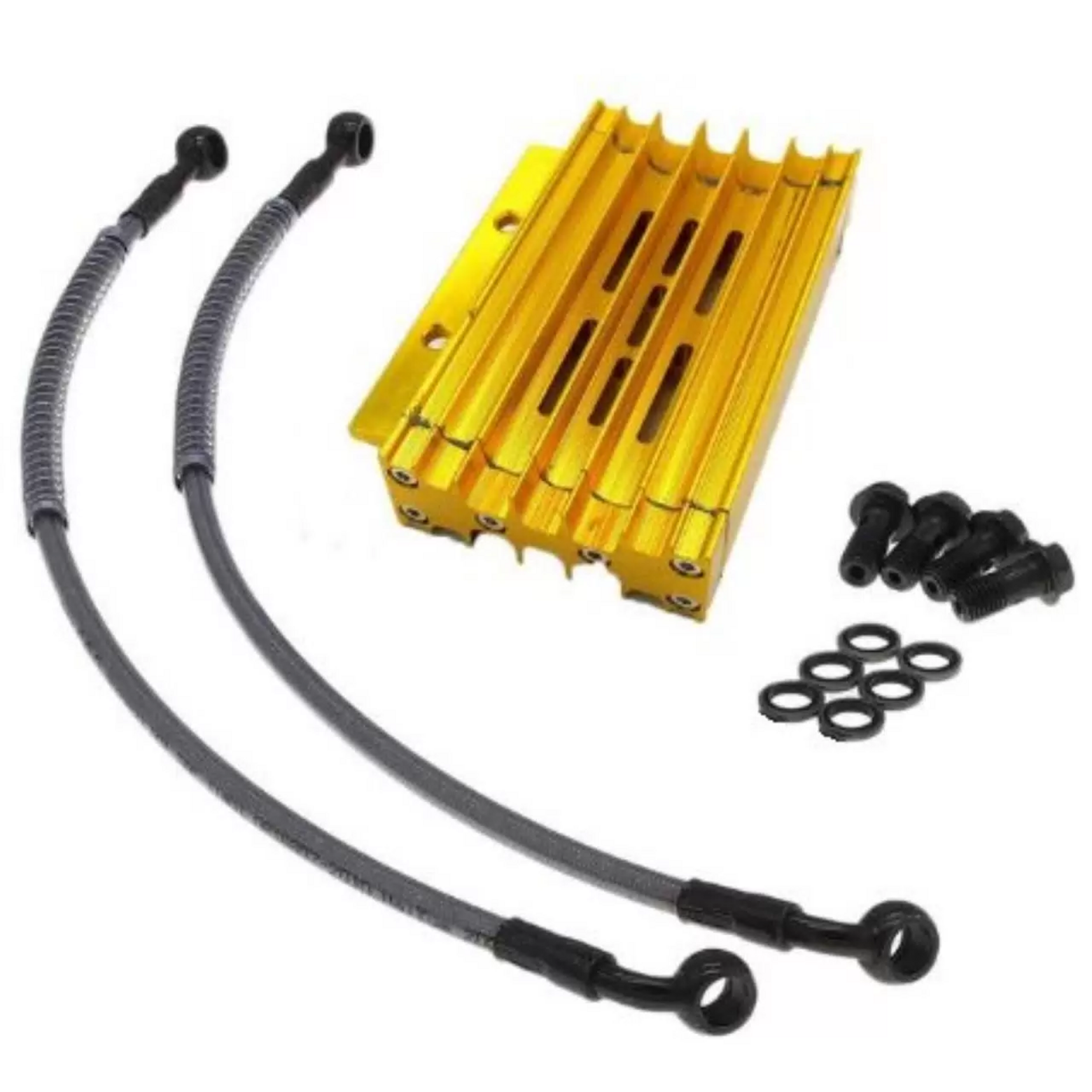 Высококачественный комплект радиатора масляного охлаждения с корпусом из прочного CNC-алюминия, ярко-золотого анодированного цвета. Разработан для установки на 90% питбайков и мопедов с объёмом двигателя от 125 до 190 см³. Обеспечивает эффективное охлаждение масла, защищая двигатель от перегрева и продлевая его срок службы.